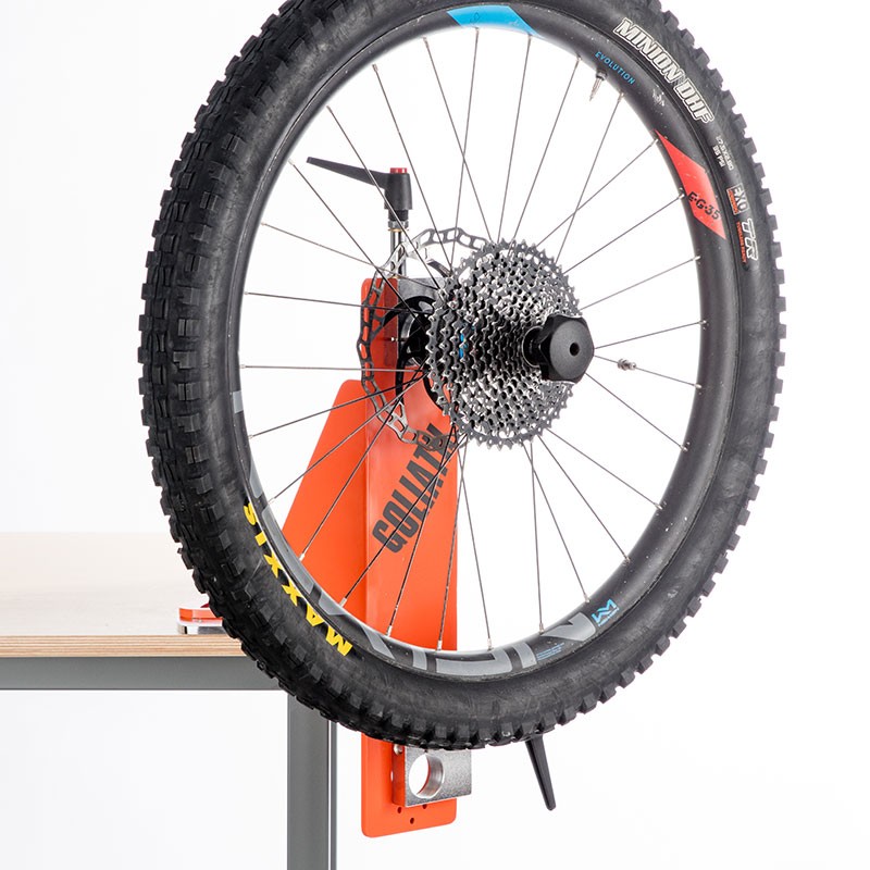 Desarrollado principalmente para realizar trabajos de ruedas como cambio de cubiertas, centrado de llantas, extracción de casete o destalonado, este soporte puede alojar cualquier herramienta compatible de la línea Goliath Bike en sus dos bloques de acople.