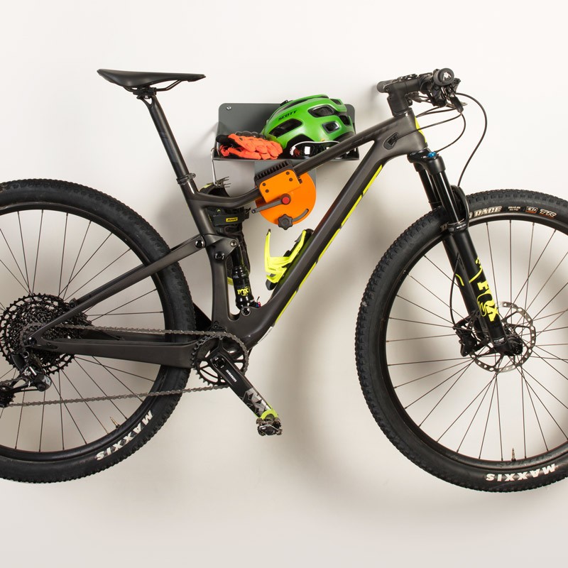 Wall mount to hold the bike and the rider's accessories all in one place.